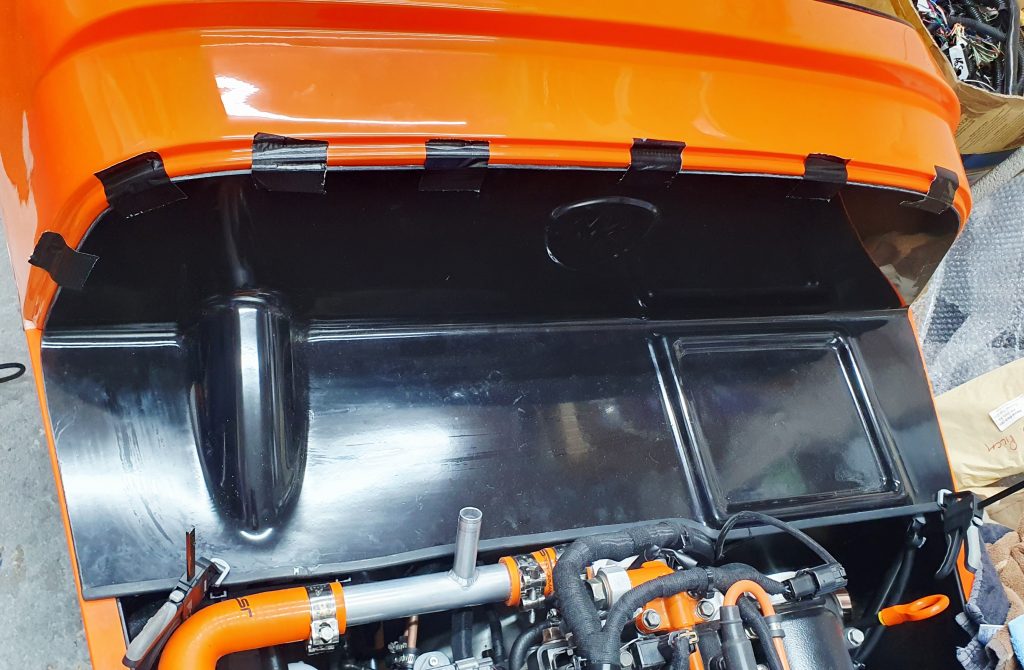 I have the older style GRP MK Indy bulkhead, as the kit is from 2022. The latest kits use an aluminium bulkhead instead, but the approach will be very similar. The first thing I had to do was to cut back the front edge of the bulkhead to fit around the coolant re-route that sticks out the back of the engine. This was a simple mark-up with masking tape and cut to shape with a saw. Then I ran a piece of U-channel rubber on the front cut edge to finish it off cleanly.