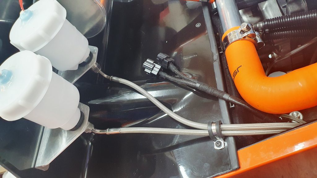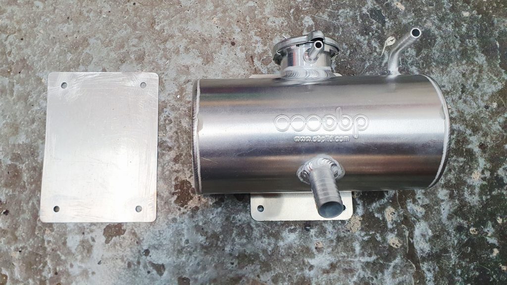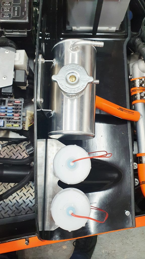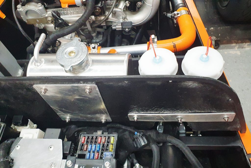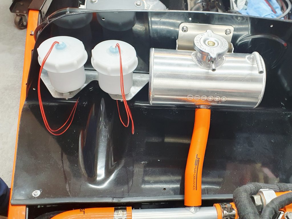 I then fitted to the MK Indy bulkhead the OBP coolant header tank that was with the kit. I used a similar approach to the brake pots. Where I made a 2mm aluminium plate for the back of the bulkhead to bolt through to provide strength. Then a short silicon hose to join the header tank to the coolant system near the back of the engine.