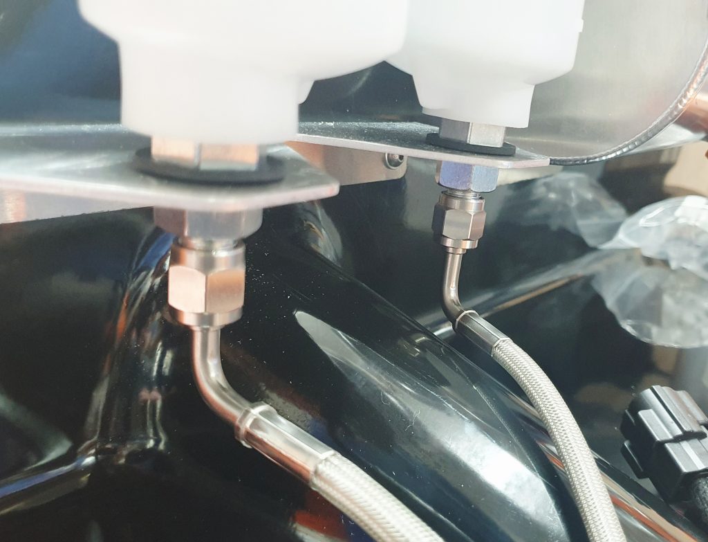 I added the brake fluid level sensors as per the manual. This drills a hole in the centre of the cap big enough for the sensor to bolt through. Once I had fixed them in place, I used a bit of Gorilla Epoxy resin to make sure they were sealed.